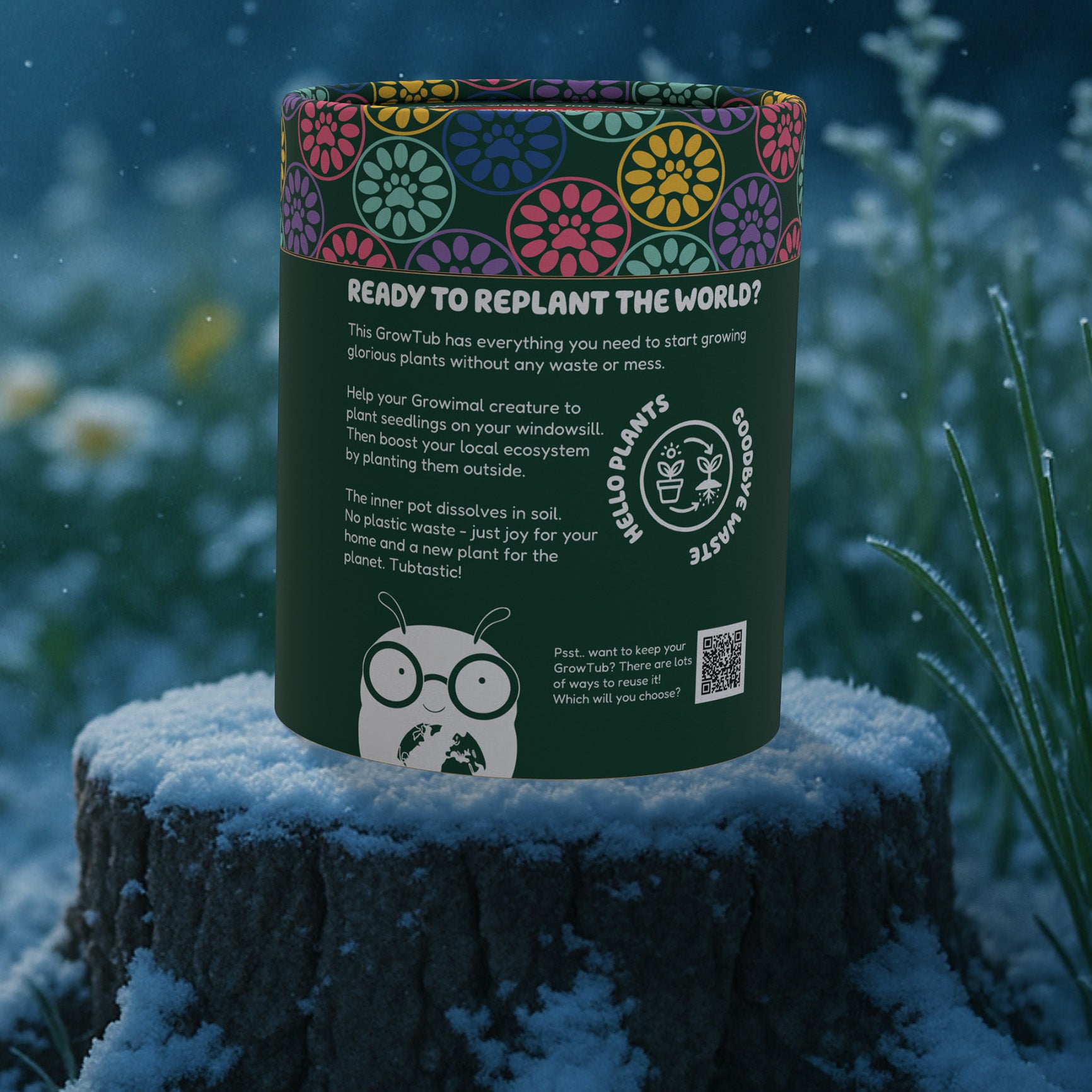 GrowTubs are character-themed growing kits designed to be fun, mess-free and completely zero-waste. Every component is reusable, recyclable or home-compostable, so once your plants are grown there’s nothing harmful left behind — no plastic pots, no rubbish, no plastic waste.